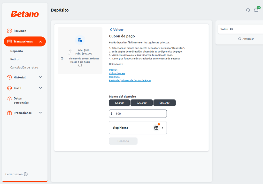 | Rapipago | Método en efectivo. Generás un cupón desde el casino y se paga en un local. | $500 | Bplay, Betsson |