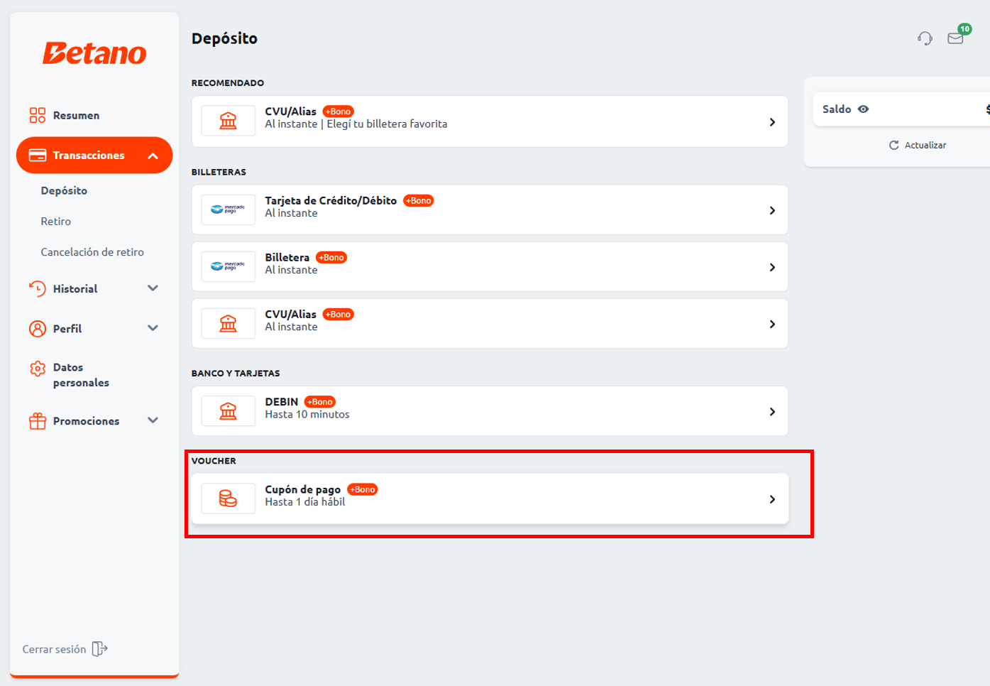 No es posible realizar retiros con cupón de pago. El método de pago para retirar dinero utilizado en los casinos online legales en Argentina es la transferencia bancaria. La cuenta del casino y la cuenta bancaria deben coincidir para poder retirar correctamente.