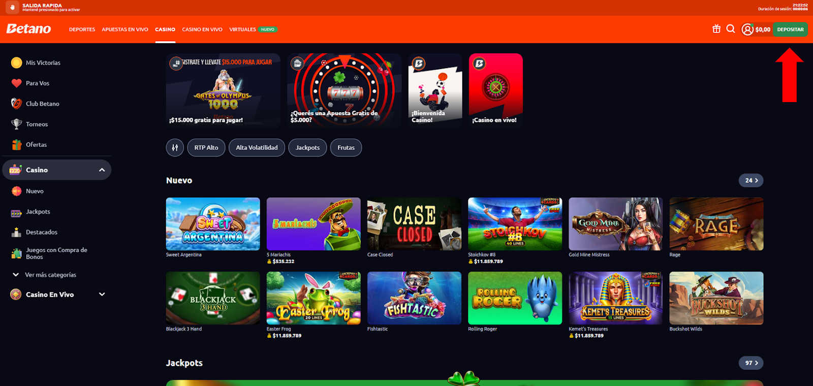 Clickeá el botón verde que aparece arriba a la derecha en la pantalla principal del casino.