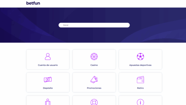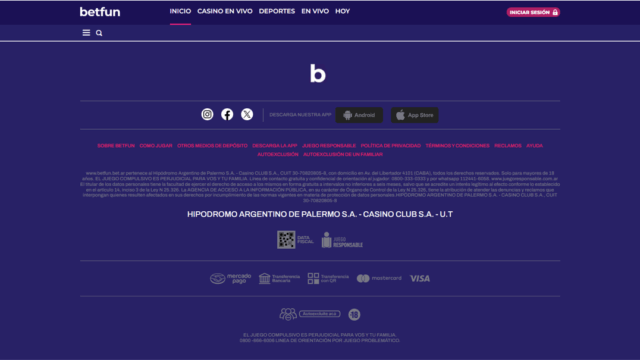 Luego la página muestra las formas para depositar y retirar con los métodos de pago, siguiendo con la sección de descargar la app Betfun, con un botón para iOS y uno para Android. Al final, hay algunas preguntas frecuentes, los botones de contacto de las redes sociales, los carteles de “Juego Responsable” y el botón para autoexcluirse.