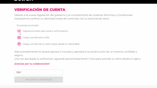 Para eso, el casino te redirigirá a un link externo donde tendrás que cargar tu DNI y tomarle varias imágenes a tu rostro. Una vez hecho eso, ya estarás verificado. Este sistema de verificación prueba la seguridad del casino y asegura que los dueños de las cuentas son los que juegan.