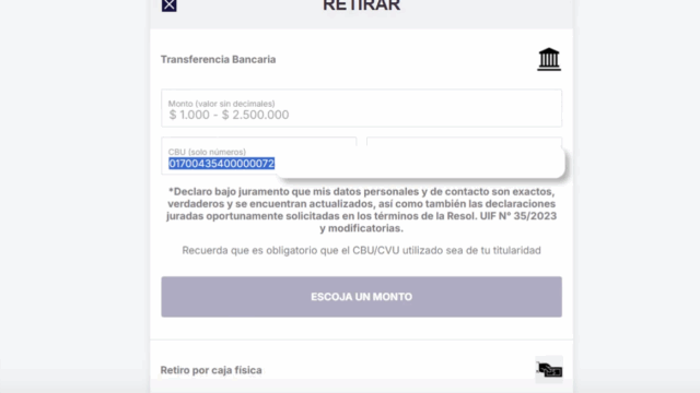 Para poder retirar, tuve que jugar el 100% de lo que deposité y el retiro mínimo es de $1.000. Una vez que cumplí con esos requisitos, me dirigí a la sección de Saldos y luego en “retirar”. Con mi cuenta ya verificada, me indicó dos opciones: transferencia o retiro en tienda física.