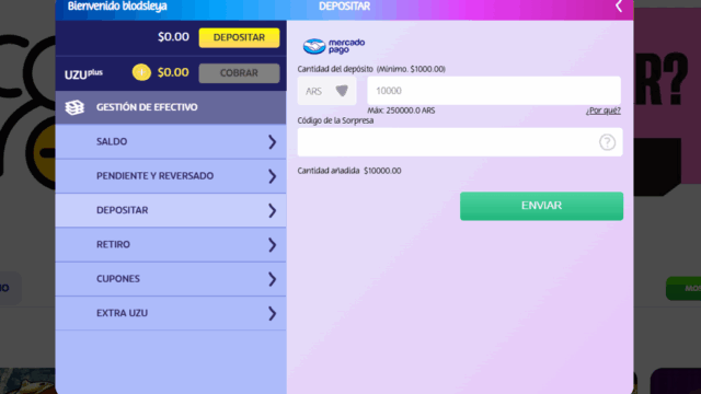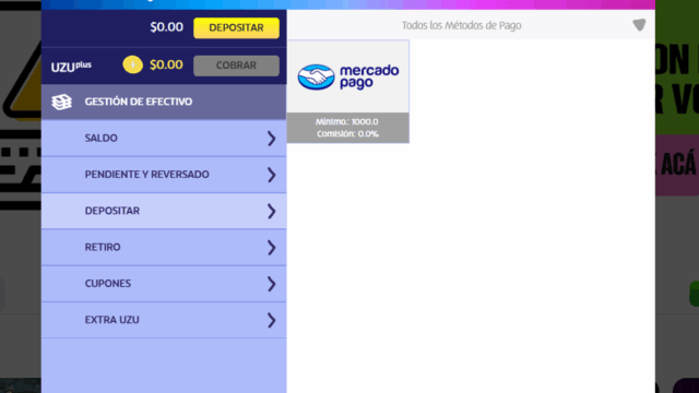 Para comenzar a jugar en PlayUZU necesitás hacer un depósito. Para esto, lo primero que tenés que hacer es ingresar a tu cuenta y dirigirte a la sección “Depósito”. El único método para depositar es con Mercado Pago, pero también podés usar tarjetas bancarias una vez dentro de la plataforma de pago. El depósito mínimo es de $1.000.