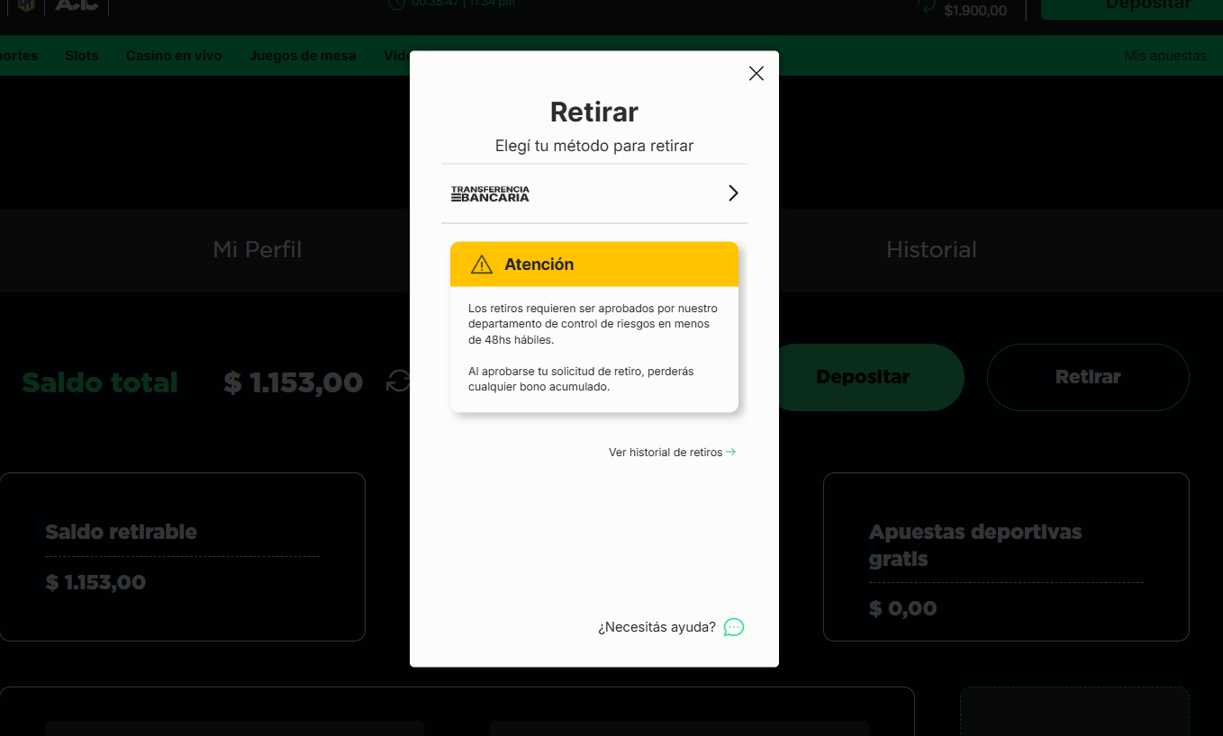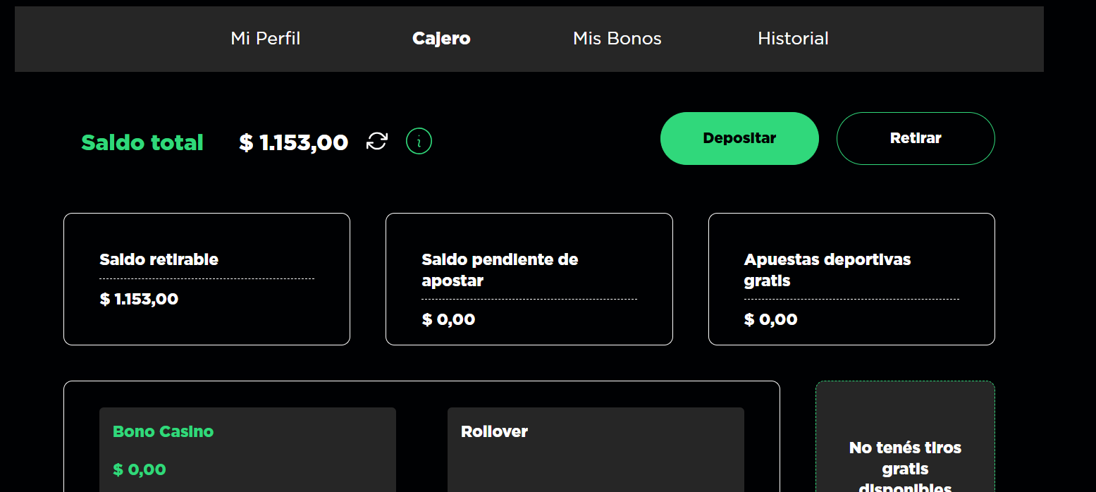 Aquí te resume todas tus operaciones y te dice si podés retirar dinero o no. Si depositaste y no has jugado, la sección que dice “Saldo pendiente de apostar” te indicará cuánto dinero tenés que apostar antes de poder retirar.