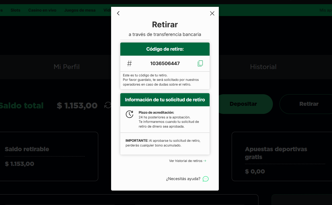 Podés verificar el ingreso del dinero volviendo al inicio o ingresando al historial de tu cuenta en la sección de Historial de depósitos y retiros.