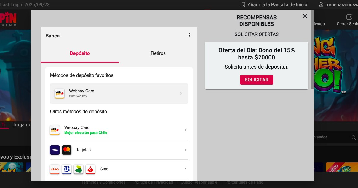 Este casino online que posee licencia de Kahnawake posee diferentes métodos de depósito, y entre ellos está la opción de uso de la tarjeta Tenpo con WebPay por un mínimo de $2.400 ¿Y por transferencia? No, esto no es posible ni por la opción de Cleo (como pasarela de pago) ni por transferencia bancaria.