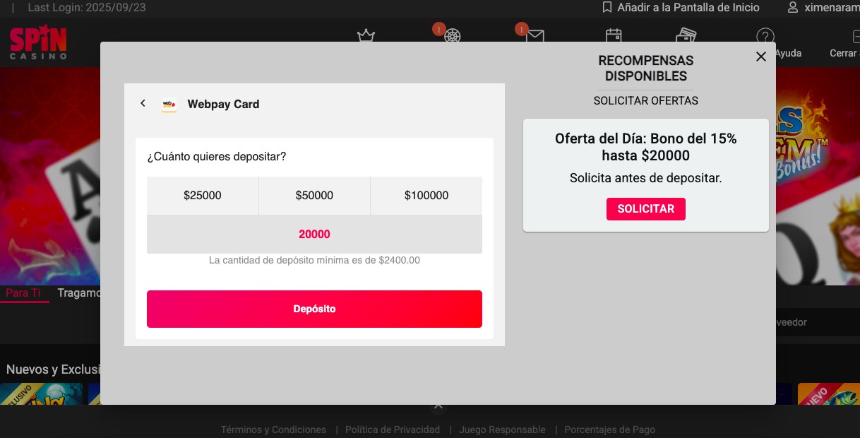 Esta plataforma permite usar Tenpo a través de WebPay con la tarjeta de débito de la cuenta. ¿El depósito mínimo? Solamente $2.400. Ahora, si deseas retirar en este casino y hacia tu cuenta Tenpo, debes saber que esto no puedes hacerlo ni por WebPay ni por transferencia (porque Tenpo, al ser una fintech, no cuenta con un código Swift y esto es exigido en Spin Casino a la hora de retirar).