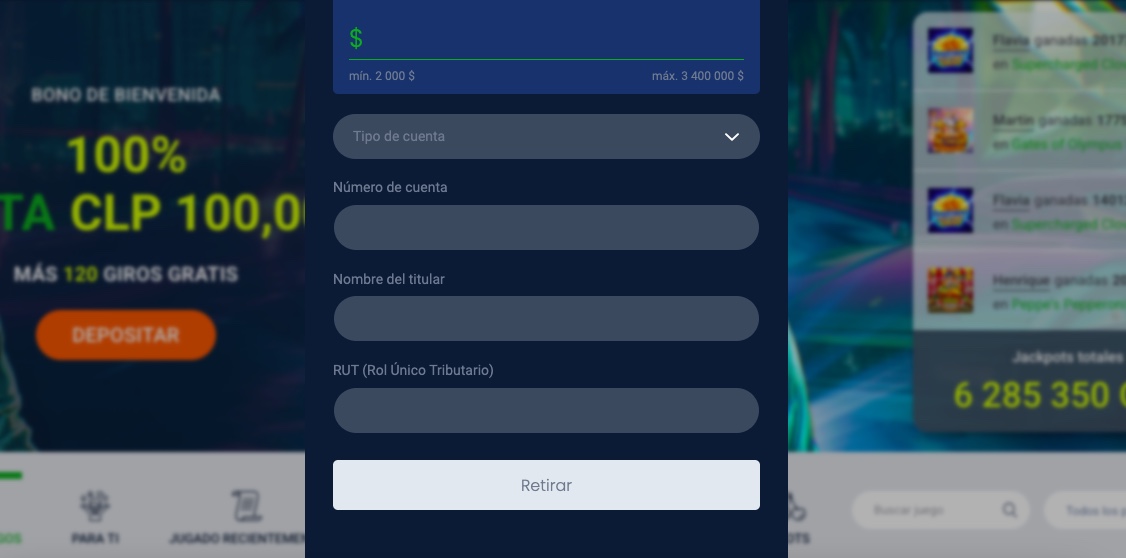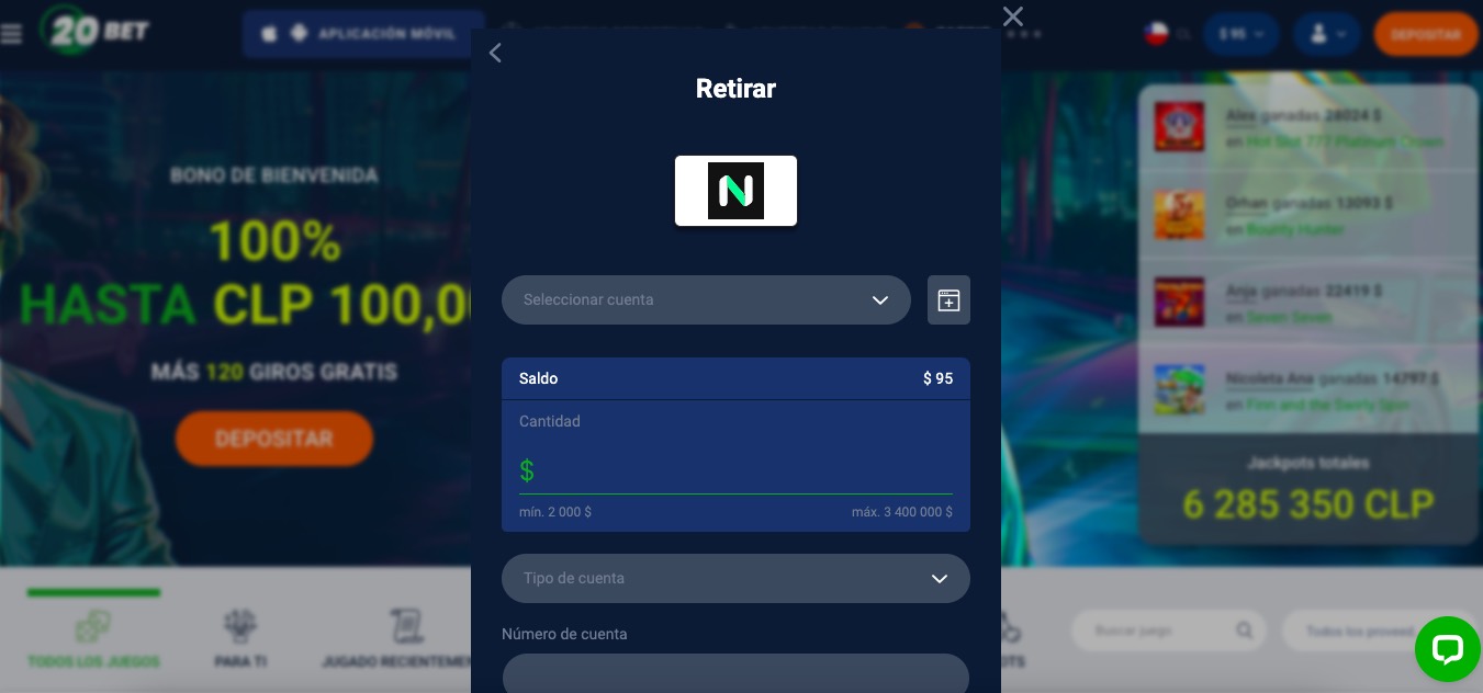 | Transferencias bancarias | Transferencias bancarias desde bancos chilenos y en pesos chilenos | Desde $1.000 | JackpotCity Spin Casino Megapari 20bet National Casino LeoVegas Lucky Nugget |