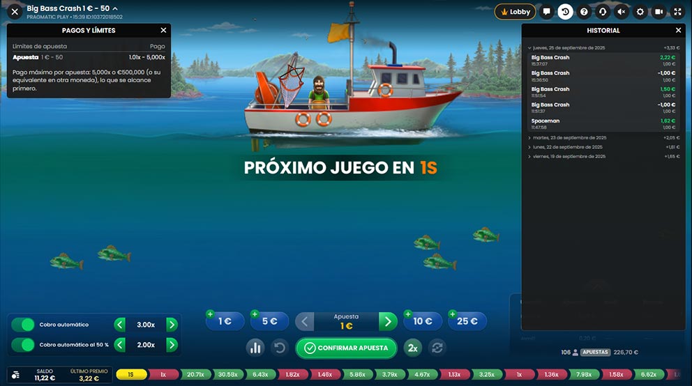 Por lo demás, la interfaz me ha resultado clara y funcional. Los controles están bien ubicados: puedes apostar a Big Bass Crash rápido, con muy pocos clics y sin liarte.