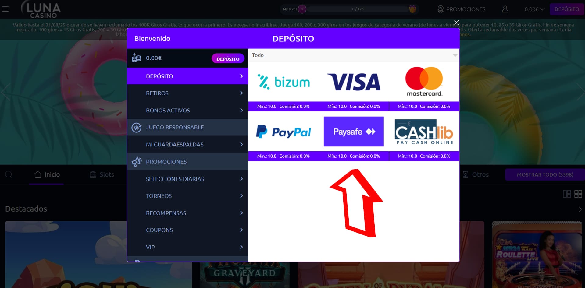Paso 2 – Seleccionar Depositar con PaysafeCard