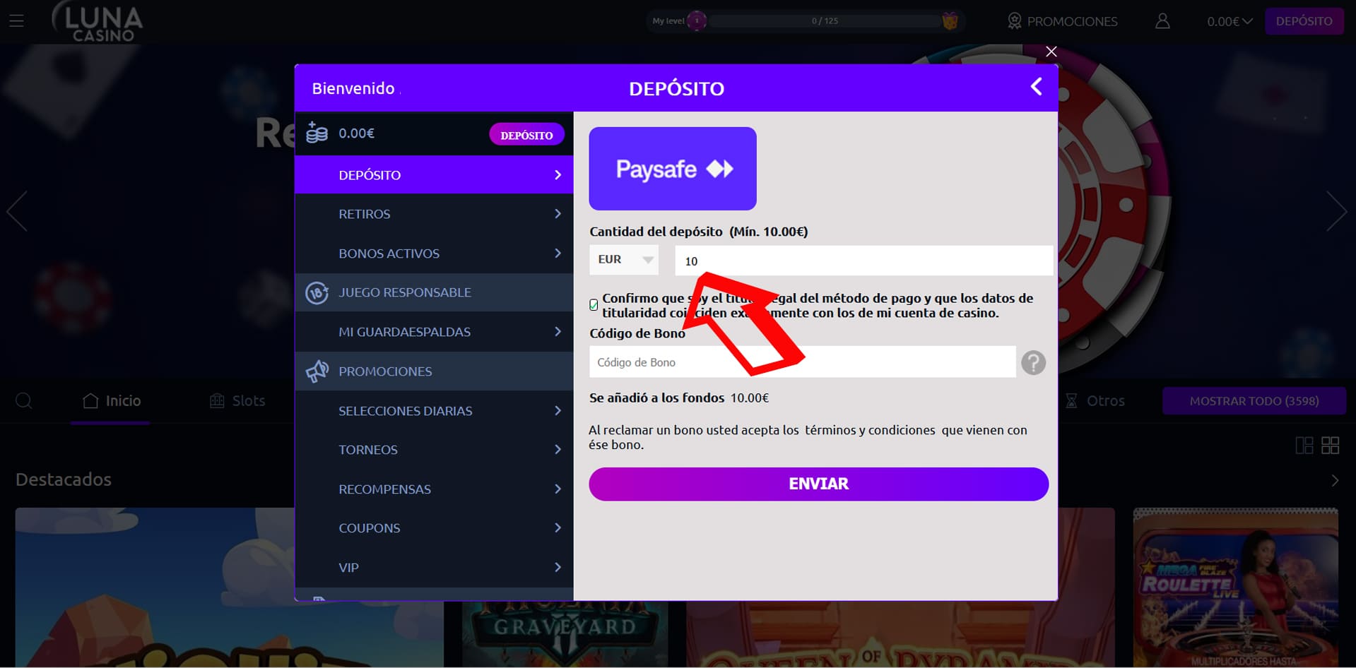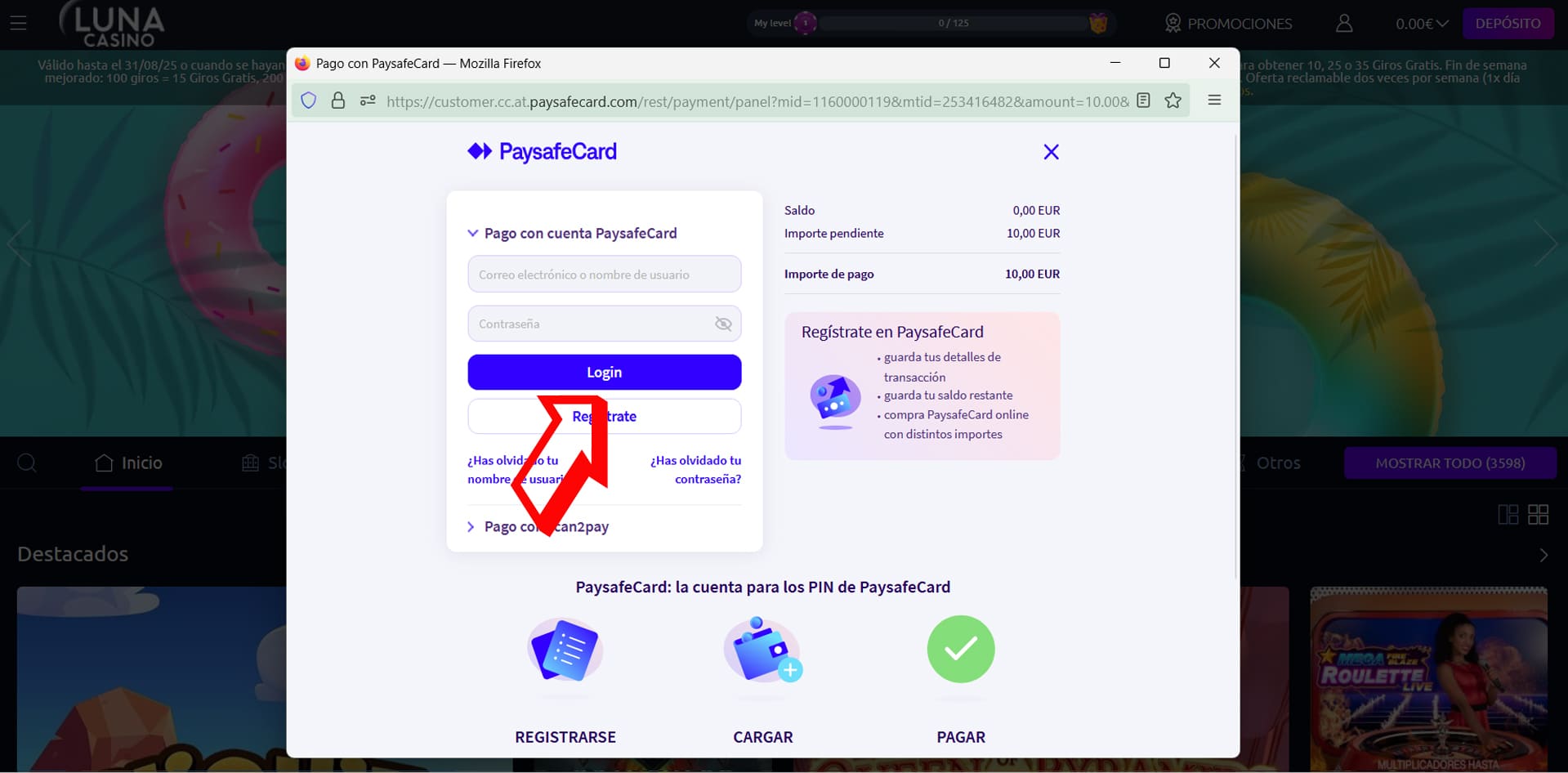 En este video puedes ver que voy a depositar 10 € con PaysafeCard en Luna Casino. Todo el proceso me lleva unos dos minutos en total y el dinero está listo para jugar de inmediato.