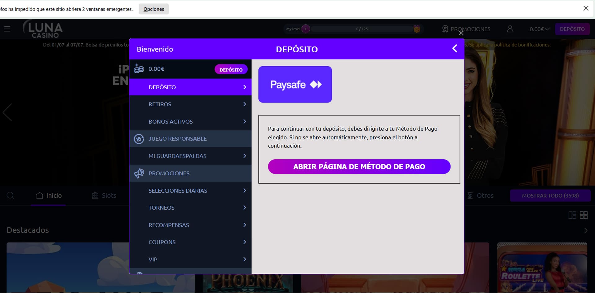 Al marcar la casilla confirmando que soy el titular de la cuenta PaysafeCard desde la que voy a depositar y pulsar sobre el botón ENVIAR, se abre una ventana emergente. En mi caso, he tenido que autorizar al navegador para que se abra, pero puede saltar de forma automática, trasladándote al sitio de PaysafeCard para que te identifiques.