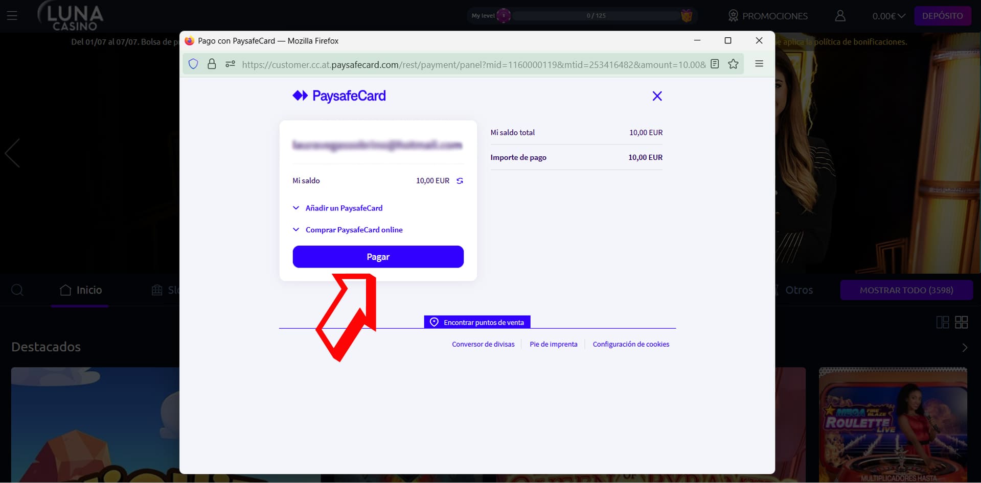 Pulso sobre el botón “Pagar” para confirmar que quiero hacer mi depósito en Luna Casino utilizando PaysafeCard como método de pago.