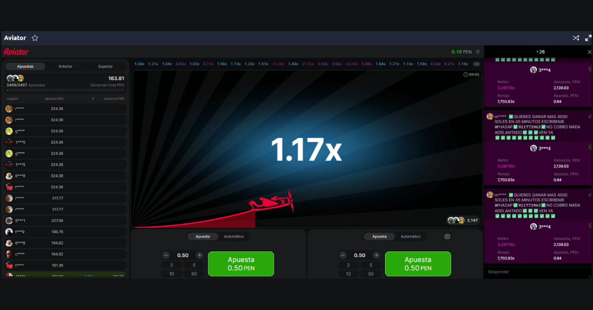 Aviator es el juego crash más reconocido en Perú y uno de los pioneros del género. Su dinámica es simple: un avión despega y el multiplicador de ganancias aumenta de forma progresiva. El objetivo es retirar la apuesta antes de que el avión desaparezca, evitando perder el monto apostado.