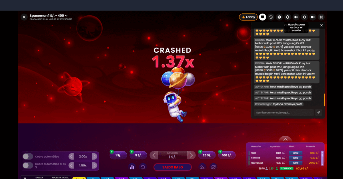 En Perú, Spaceman está disponible en casinos con licencia de MINCETUR como Betsson y Coolbet, con apuestas mínimas accesibles y soporte para métodos de pago locales como Yape.