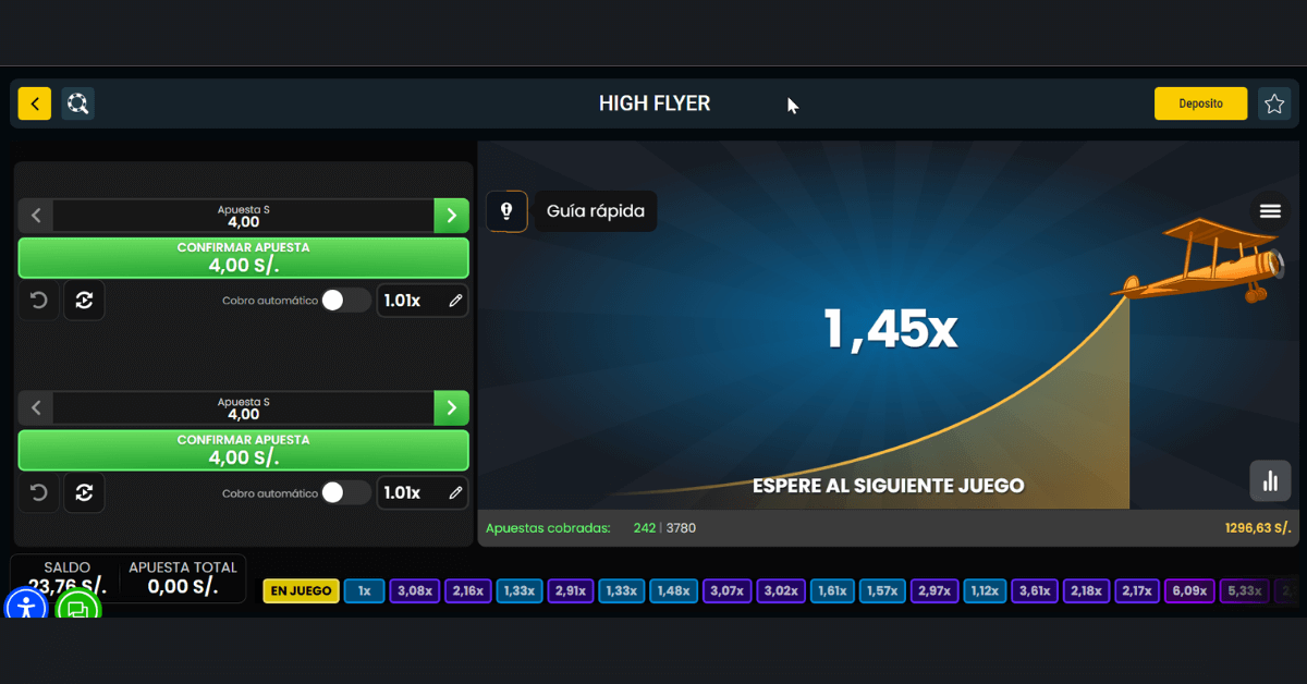 Con un RTP del 97 %, uno de los más altos en crash games, y apuestas mínimas accesibles en soles, High Flyer está disponible en varios casinos online que aceptan jugadores peruanos, ofreciendo compatibilidad total con dispositivos móviles y métodos de pago locales.