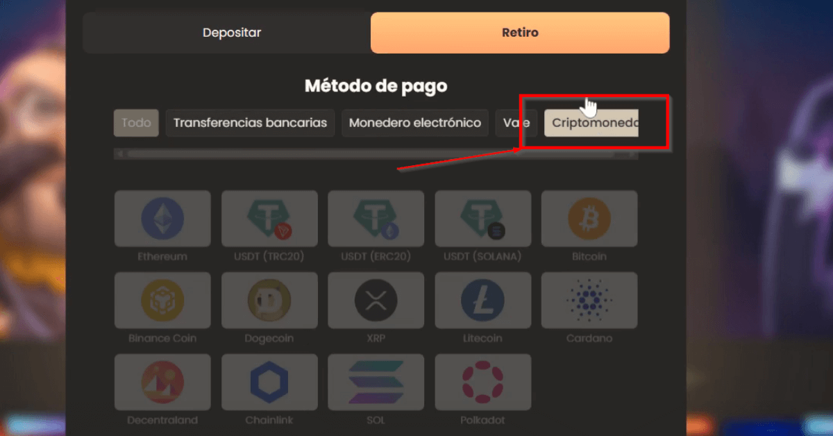 Paso 3: Selecciono la criptomoneda que deseo retirar