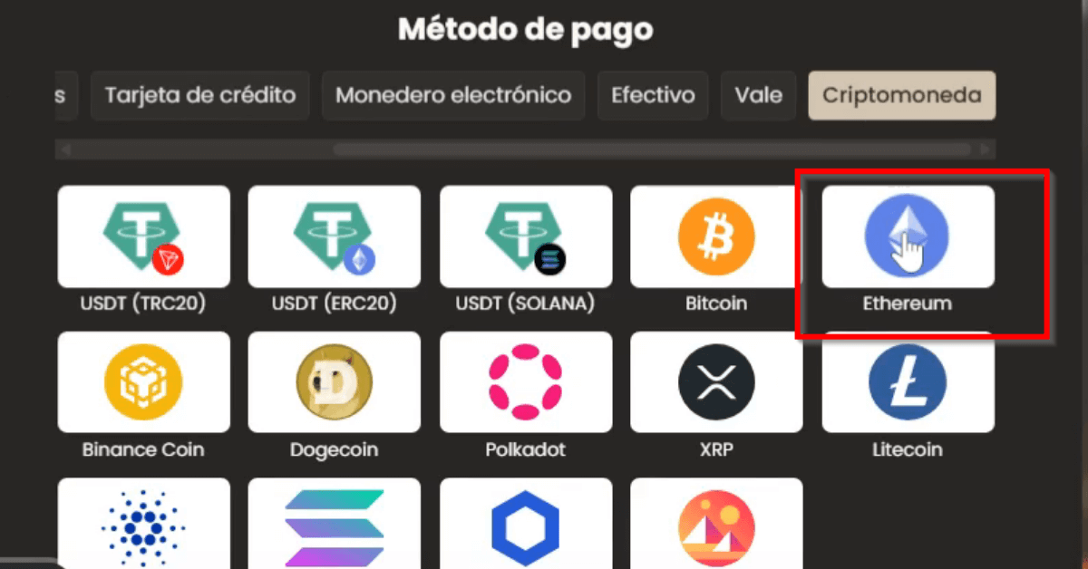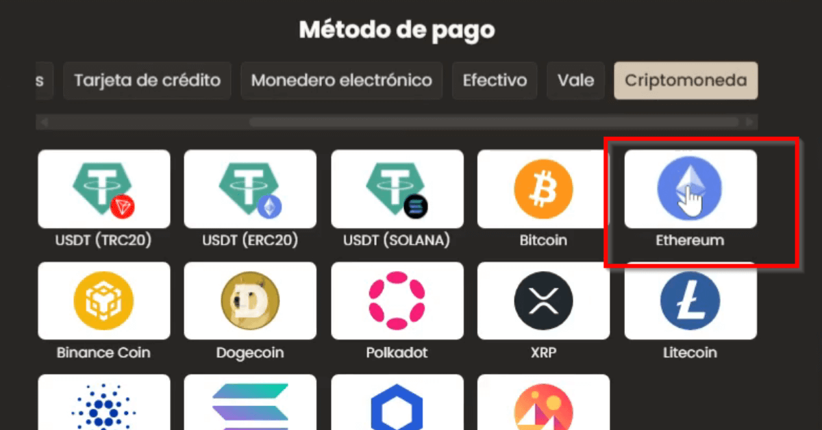 En la lista de métodos disponibles, siempre selecciono criptomonedas. Esta opción suele estar junto a transferencias bancarias, tarjetas y billeteras electrónicas.