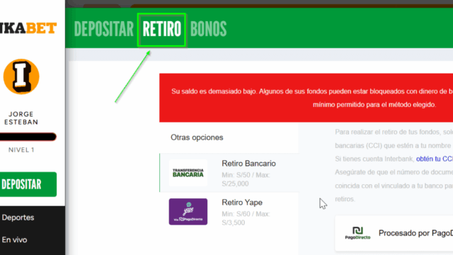 Desde mi cuenta en el casino online Perú, entro a la sección “Retiro” y elijo Transferencia Bancaria como método. Me aseguro de que el casino trabaje con PagoDirecto o proveedores confiables, y que el retiro mínimo esté claro (generalmente S/ 60). Si tengo saldo bloqueado por bonos, el sistema me lo notifica.