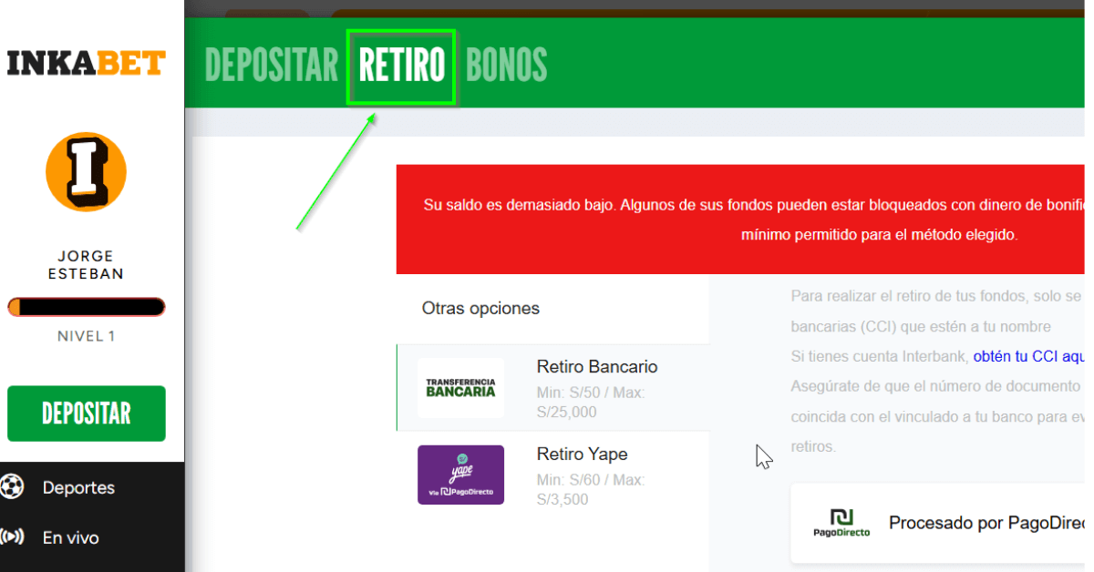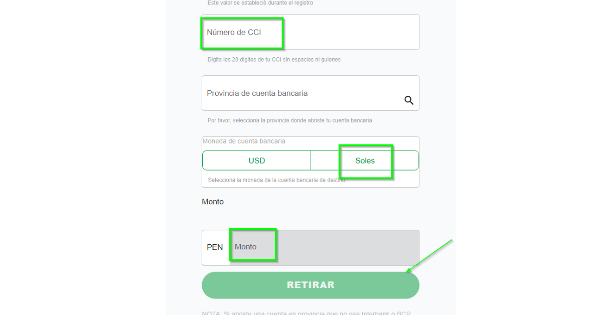 Ingreso mi código interbancario (CCI), así como el monto a retirar (mínimo S/ 60, máximo hasta S/ 25,000) y selecciono la moneda PEN. Verifico que el saldo esté disponible y que no haya restricciones por bonos activos. Presiono el botón “RETIRAR” y el sistema procesa la solicitud vía PagoDirecto.