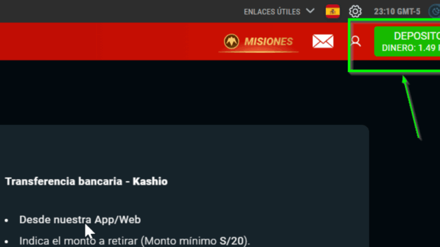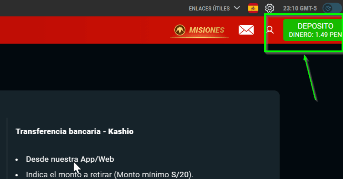 Paso 1. Selecciono el casino y entro al panel de depósito