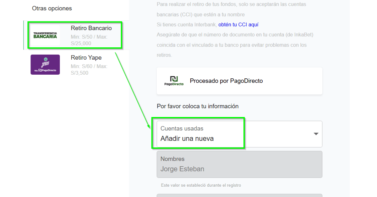 Selecciono “Añadir nueva cuenta” para poder completar mis datos reales: nombres, número de CCI (20 dígitos que debo tener a la mano), banco y provincia. Todo debe coincidir con mi cuenta bancaria para evitar rechazos. El sistema valida que esté usando cuenta propia y que el retiro sea en Soles (PEN).
