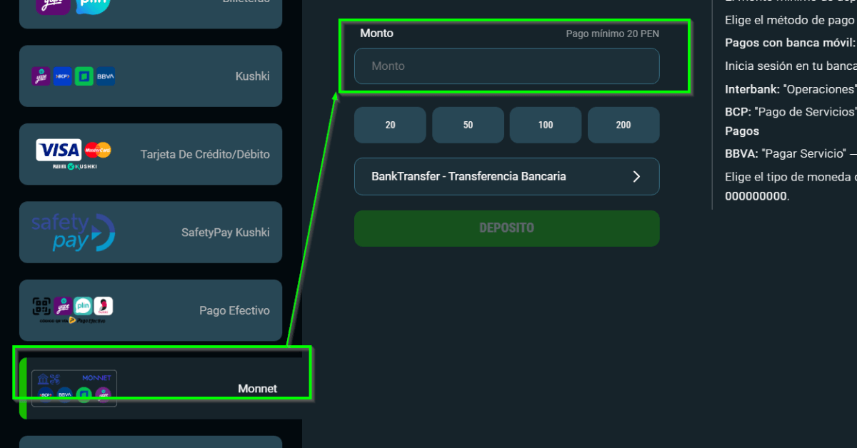 Desde mi cuenta en un casino online Perú con licencia, ingreso al panel de “Depósito”. Elijo el método Transferencia Bancaria o BankTransfer, según el proveedor (Kashio, Monnet, Culqi). Me aseguro de que el monto mínimo esté claro y que el sistema trabaje con bancos locales como BCP, BBVA o Interbank.