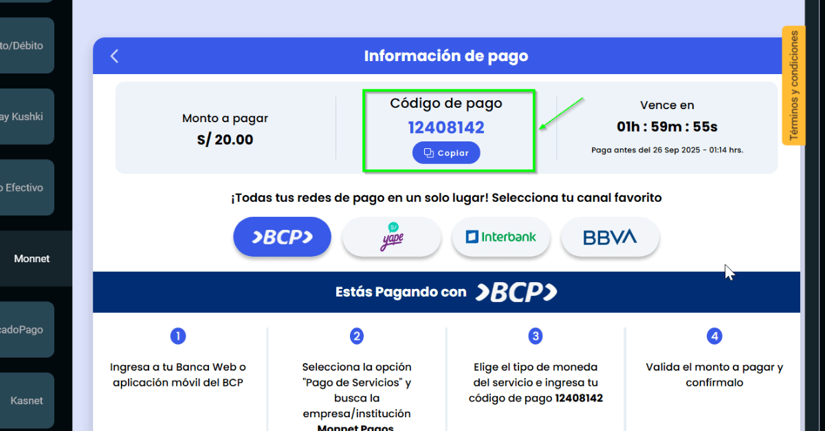 Ingreso el monto a depositar (mínimo suele ser S/ 20 o S/ 30) y el sistema me muestra un código de pago único, junto con el tiempo límite para completar la operación. Este código lo usaré en mi app bancaria para validar el pago. Todo queda trazable y respaldado.