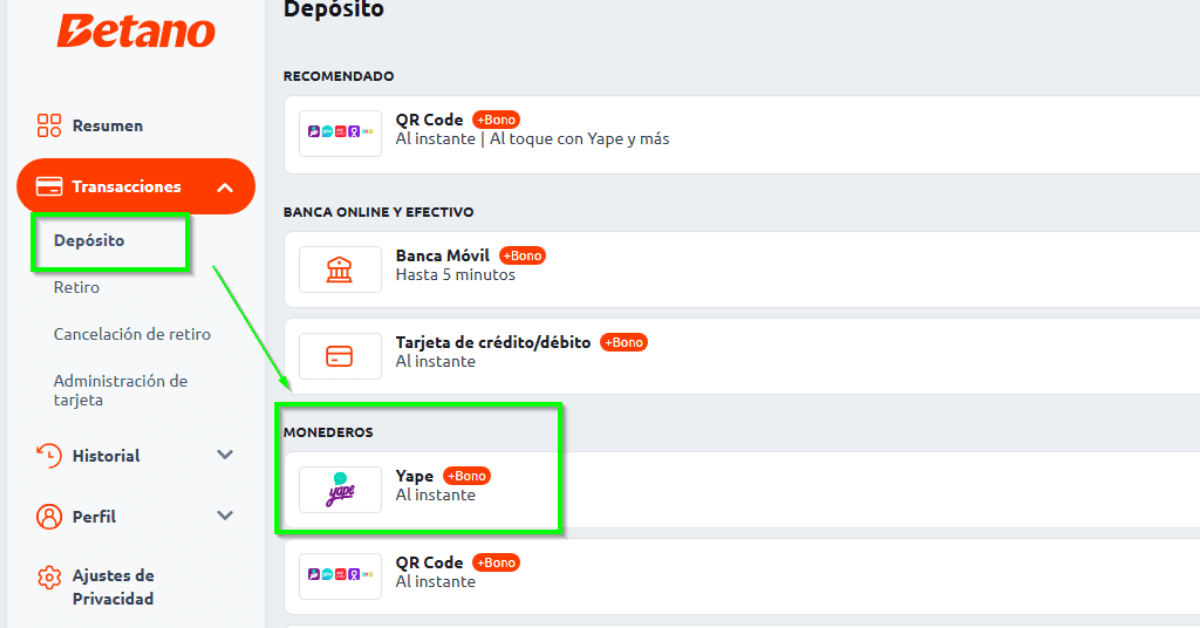 Depositar con Yape en Betano es rapidísimo, solo escaneo el QR desde la app y en segundos tengo saldo para jugar. Su plataforma es moderna, con más de 800 tragamonedas y juegos en vivo, sumado a su bono de bienvenida del 100 % funciona también con pagos por Yape. Lo uso cuando quiero jugar sin complicaciones y con retiros rápidos.