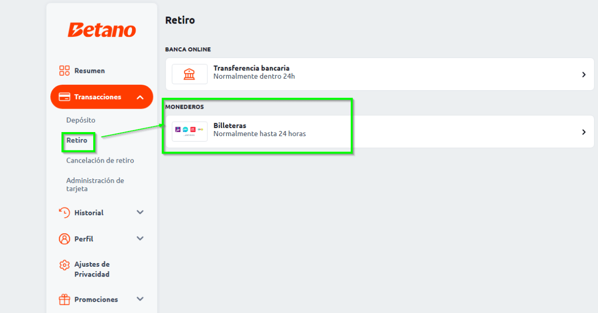 Primero entré a mi cuenta del casino y desde el menú principal seleccioné la opción de Transacciones. Ahí encontré el botón de Retiro, que es donde se inicia el proceso para transferir las ganancias.