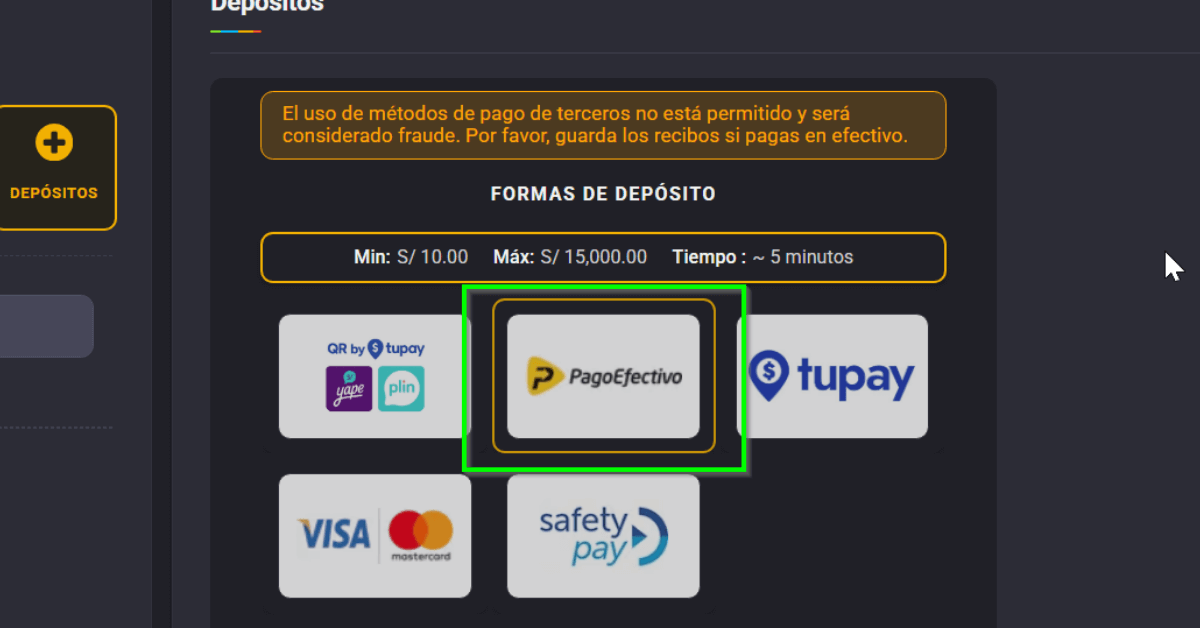 En la sección de depósitos encontré varias alternativas como Yape, Plin y tarjetas bancarias. Elegí PagoEfectivo porque me permite pagar desde mi banca móvil o en agentes físicos, sin necesidad de exponer mis tarjetas.