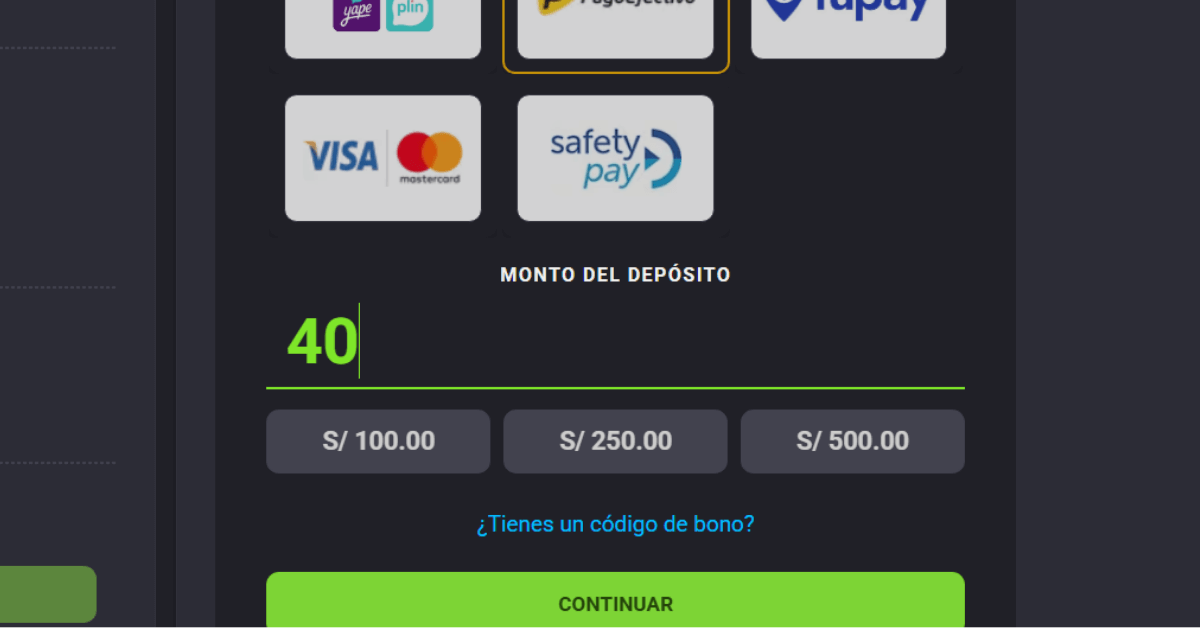 El casino me pidió que ingresara el monto a depositar. En este caso seleccioné S/ 40. Lo bueno es que los depósitos mínimos con PagoEfectivo suelen ser accesibles, desde S/ 10 o S/ 20 según el operador.