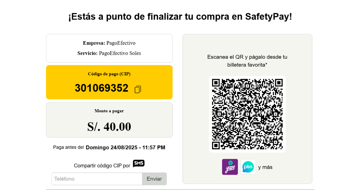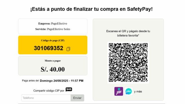 El sistema me mostró un código CIP único junto con la información del pago. Con este código pude realizar el depósito desde la banca móvil de mi banco o en un agente autorizado. También me dieron la opción de escanear un código QR para facilitar la operación.