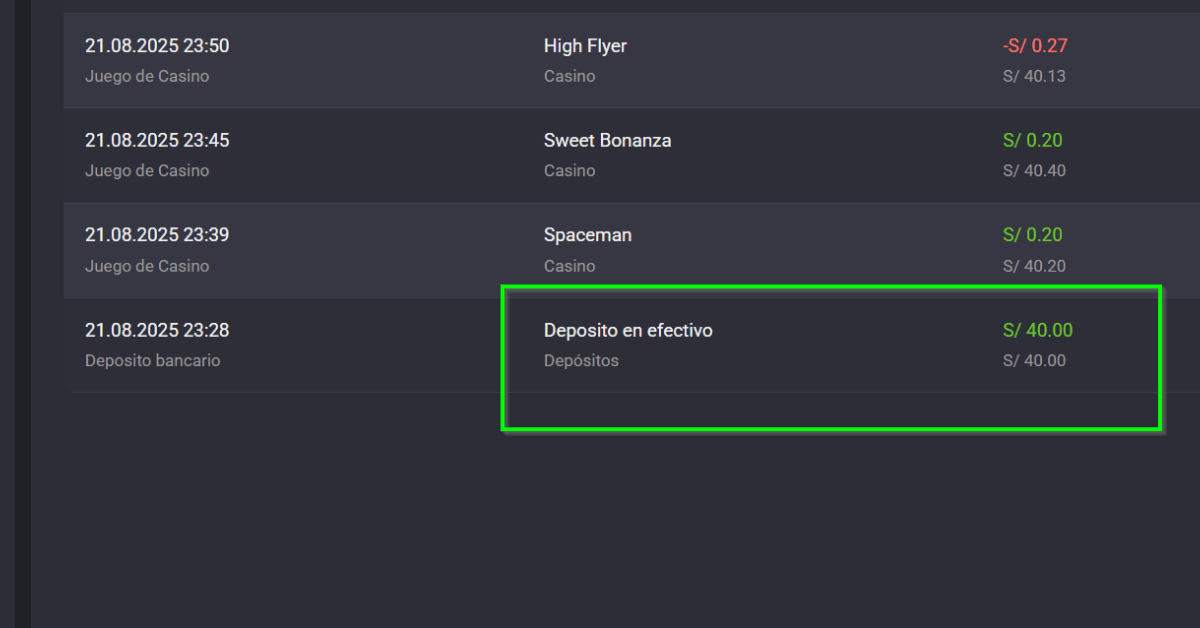 Tras pagar el código CIP, regresé a mi cuenta del casino y en cuestión de minutos vi reflejado el depósito de S/ 40. El saldo quedó disponible de inmediato para jugar en tragamonedas online, ruleta y otros juegos de casino con dinero real.