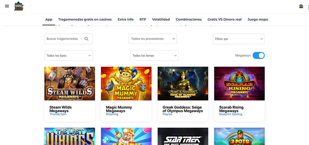4. Mantén el interruptor Megaways encendido para aplicar filtros por temática, proveedor y orden alfabético o de publicación.