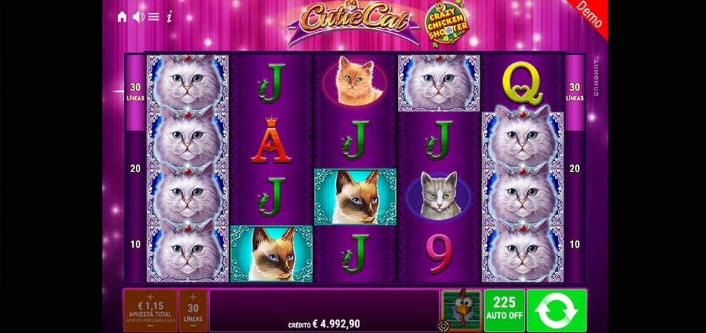 Puedes jugar seleccionando 10, 20 o 30 líneas de pago (desde 0,35 hasta 5 por línea) y los símbolos de pago principales son gatitos cuquis. Nada fuera de lo común hasta aquí. El caso es que, por una razón que no alcanzo a entender (y qué más da), esta tragamonedas de gatos incluye un juego de disparos a un pollo loco. Está disponible activando la opción de apuesta adicional. Ahí lo dejo.