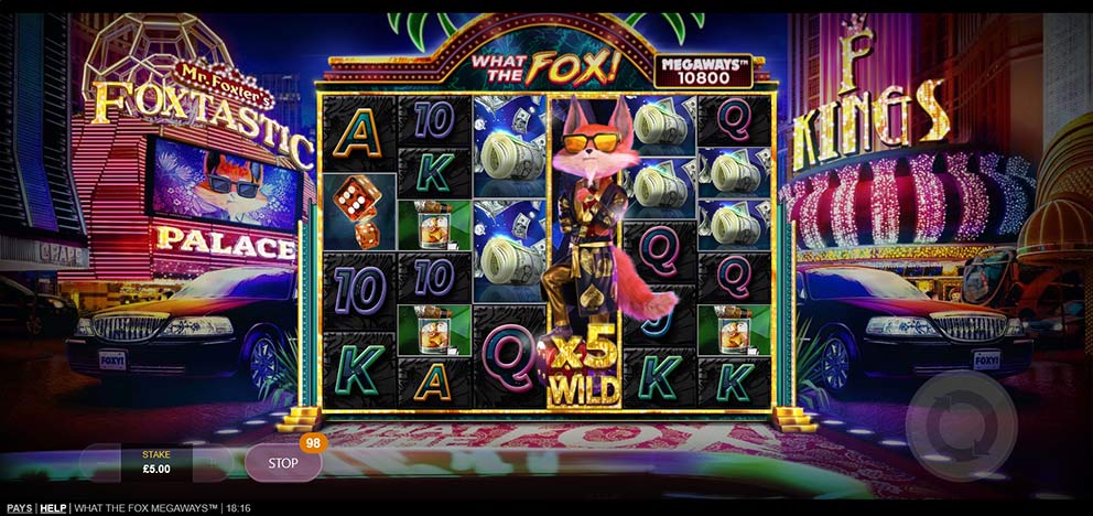 Los comodines apilados de What The Fox Megaways se llaman Wily Wilds y están dedicados a un zorrito muy chulito que es el protagonista del juego. Imagínate el batín de seda de Hugh Hefner sobre un zorro pelirrojo con gafas de sol de efecto espejo dorado. Te deja jugar desde 0,10 hasta 50 por giro.