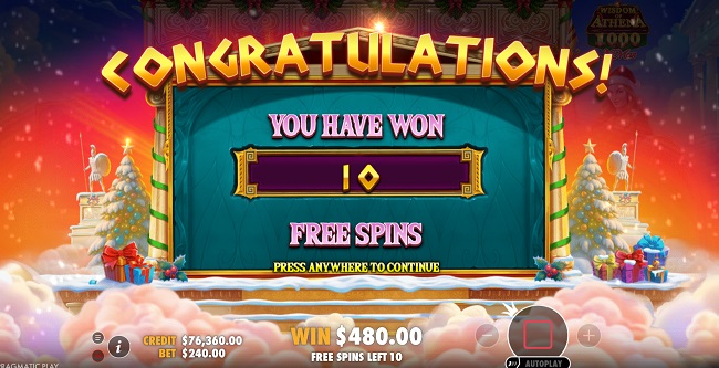 La activación de los giros gratis en Wisdom of Athena 1000 Xmas depende directamente de la combinación de símbolos Scatter. Necesitas al menos 4 de ellos para iniciar esta ronda, en la cual se acreditan los primeros 10 giros. Si aparecen tres o más símbolos Scatter durante esta ronda, automáticamente se acreditan 5 tiradas gratis adicionales.