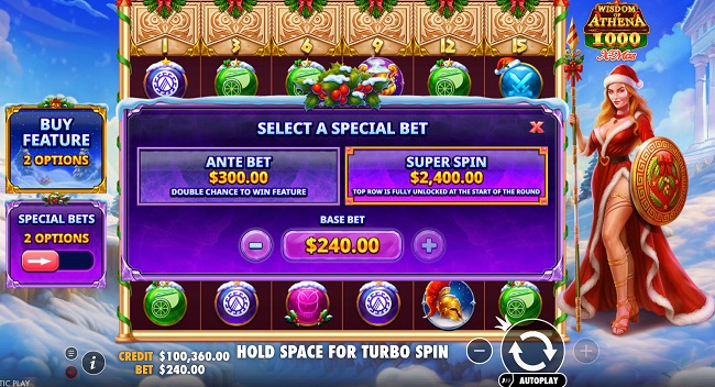 Antes de hacer una tirada en Wisdom of Athena 1000 Xmas tienes la opción de mejorar tu apuesta. Al hacer clic en Special Bets puedes duplicar tus posibilidades de ganar el Bonus con la Ante Bet. También puedes activar una Super Spin y acceder a un multiplicador de x200 para tus ganancias.