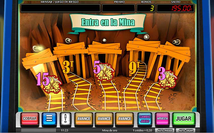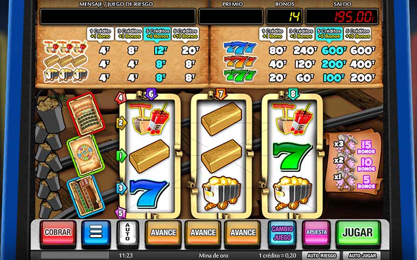 La primera versión de La Mina de Oro (además hay Plus, Golden Edition, Halloween, Navidad…) es un 3×3 de 1 línea en el juego inferior, que sube a entre 5 y 8 líneas en el juego superior. Produce avances siempre que tengas 2 símbolos iguales (o 1 símbolo + 1 comodín), además de entre 1 y 4 avances aleatorios en giros al azar. Sus símbolos especiales son bonus para ir al juego principal y 4 símbolos de acceso a los mini juegos.