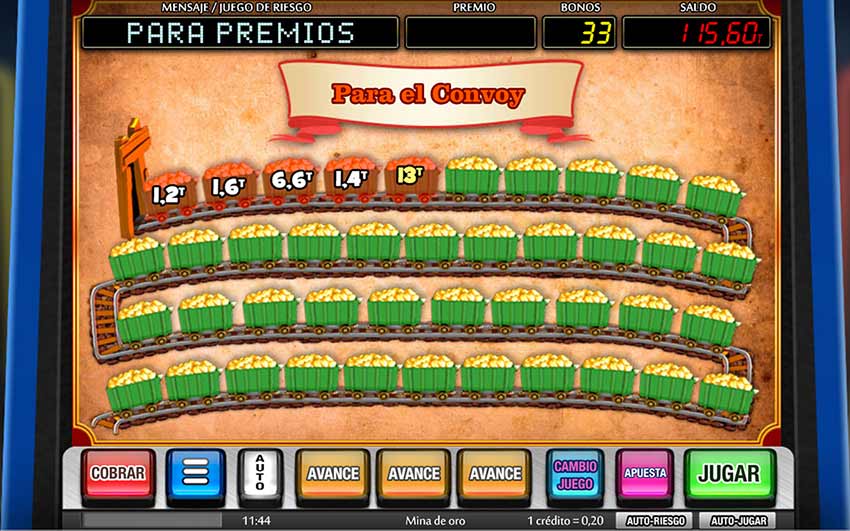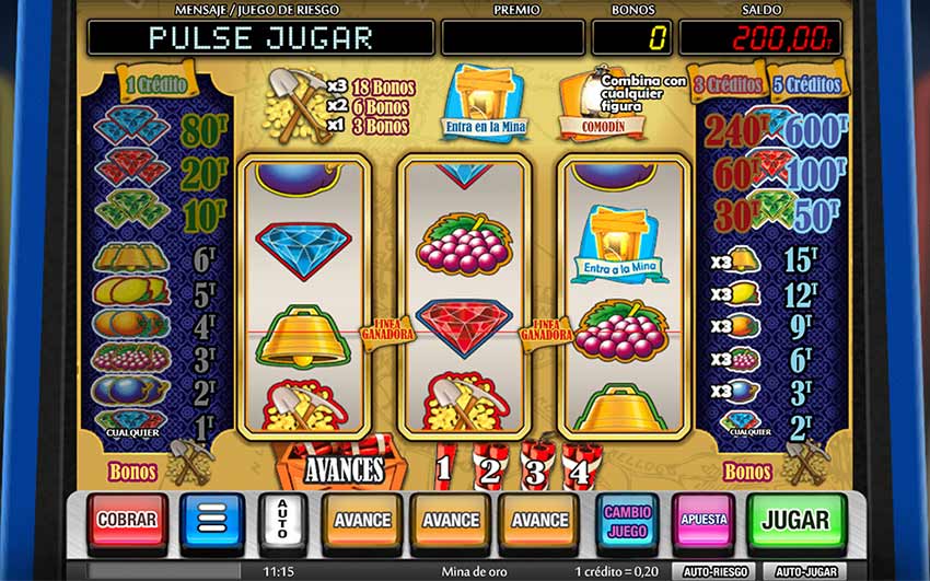 La tragamonedas La Mina de Oro es una slot de 3 rodillos que recrea muy bien la estética de una máquina de bar de toda la vida. Utiliza solo 3 rodillos con 1 línea de pago única en el juego base, con símbolos de pago de frutas. Y tiene un juego principal con entre 5 y 8 líneas de pago, en el que los símbolos son de temática minera: cascos, picos, vagonetas, lingotes…