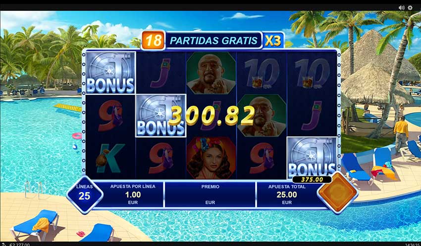 La slot de Torrente ofrece solo dos tipos de símbolos especiales: comodines y bonus. Los comodines solo están disponibles para los rodillos 2-3-4. Si sacas tres, accedes a una ronda de 15 giros gratis reactivables sacando otros 3.