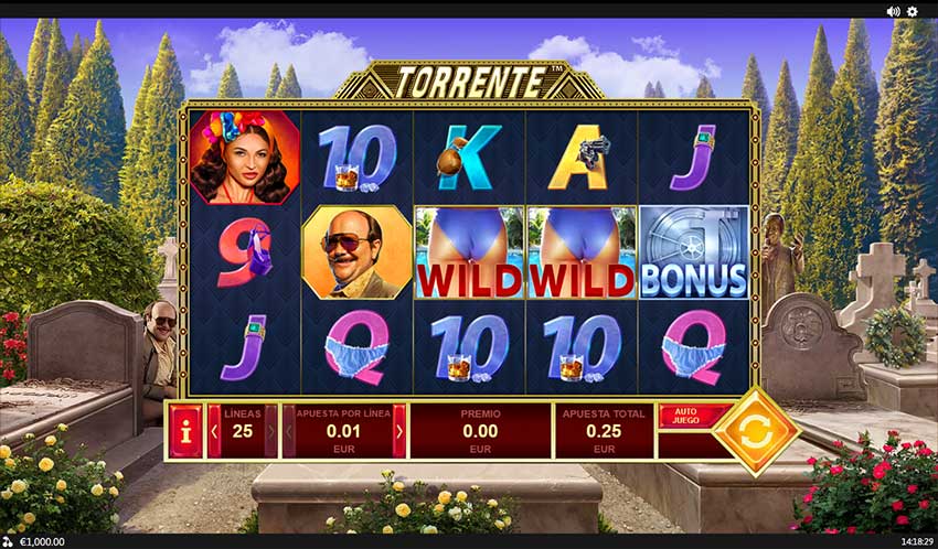La tragamonedas Torrente es muy convencional en su mecánica, símbolos especiales y características. Tiene un tablero 5×3 con 25 líneas de pago fijas y un límite de apuesta de entre 0,25€ y 12,5€, 25€ o 500€ por tirada, dependiendo del casino.
